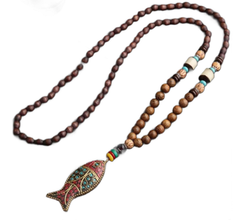 108 Mala náhrdelník z dřevěných korálků s přívěskem ryby – hojnost, klid a plynutí života