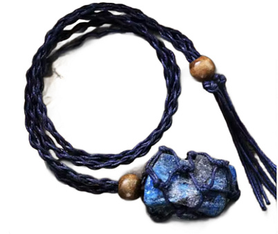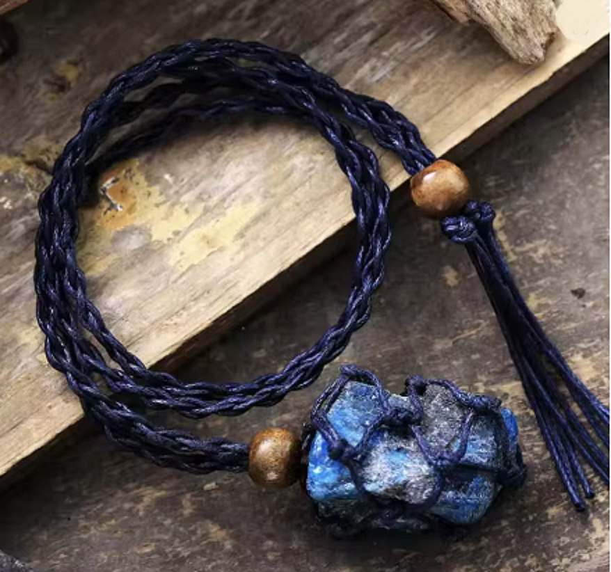 Tento originální náhrdelník z přírodního apatitu zaujme svým hlubokým modrým odstínem a výraznou energií. Surový kámen je zasazen do ručně pletené síťky, která podtrhuje jeho přirozenou strukturu a dává šperku autentický boho vzhled. Tmavá pletená šňůrka s dřevěnými detaily působí elegantně a zároveň přirozeně. Každý kus je originál – stejně jako energie, kterou do života přináší.