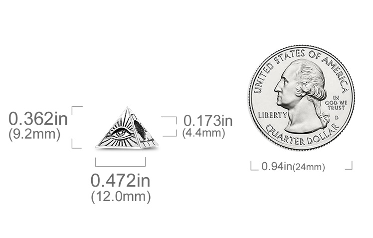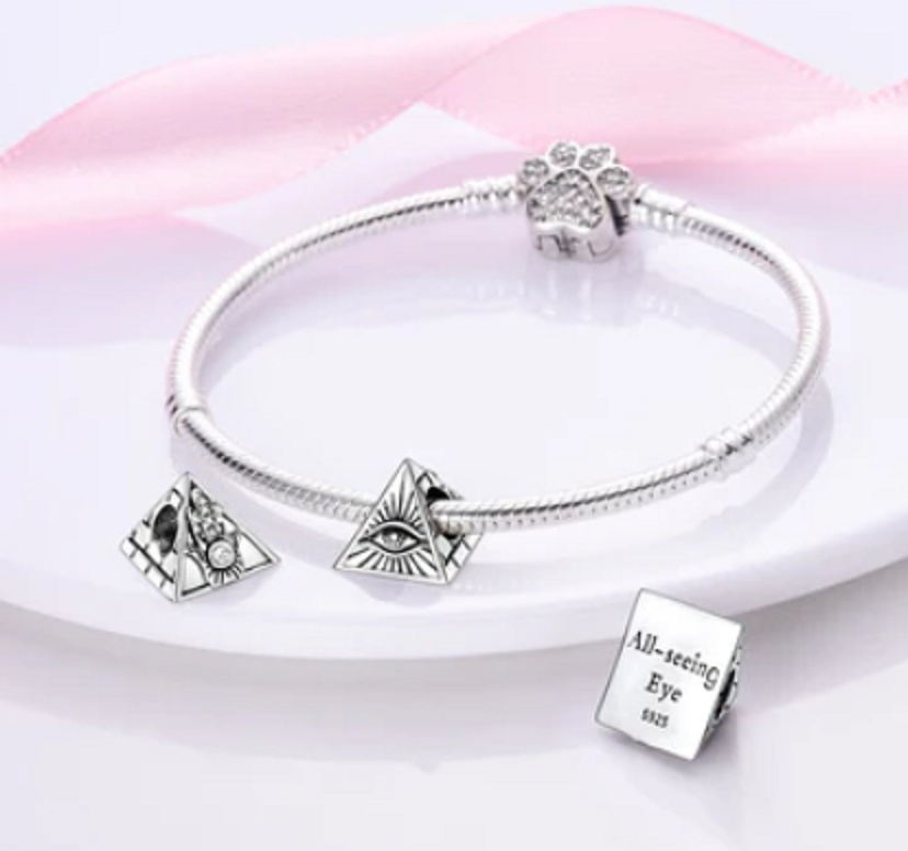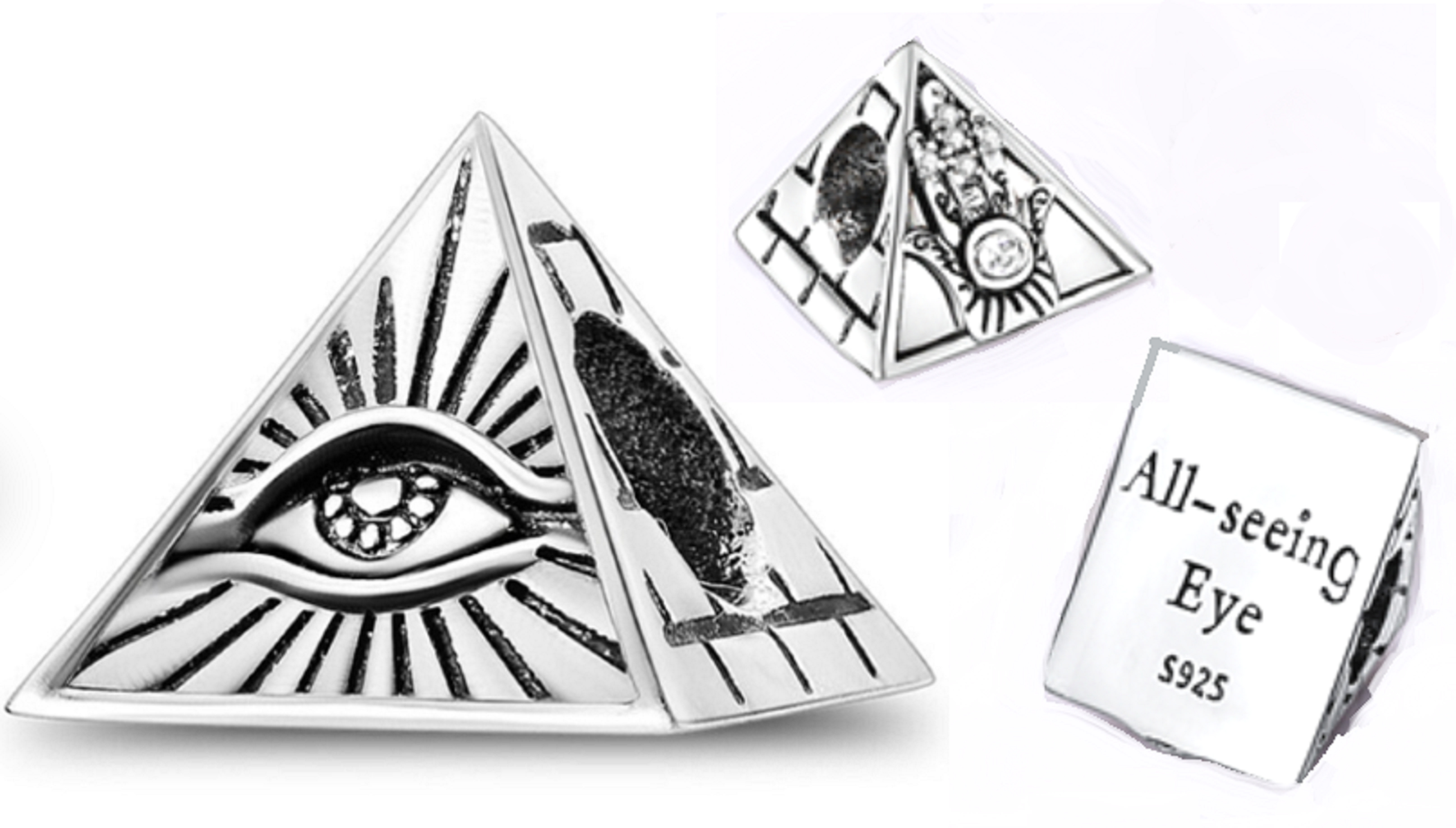 Prívesok s pyramídou s ochranným okom a rukou, ktorý sa nosí na ochranu a pre šťastie.Na spodnej časti prívesku je vyrytý nápis "Vševidiace oko".