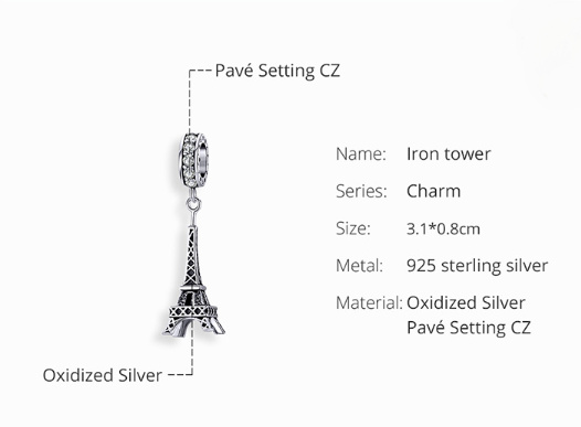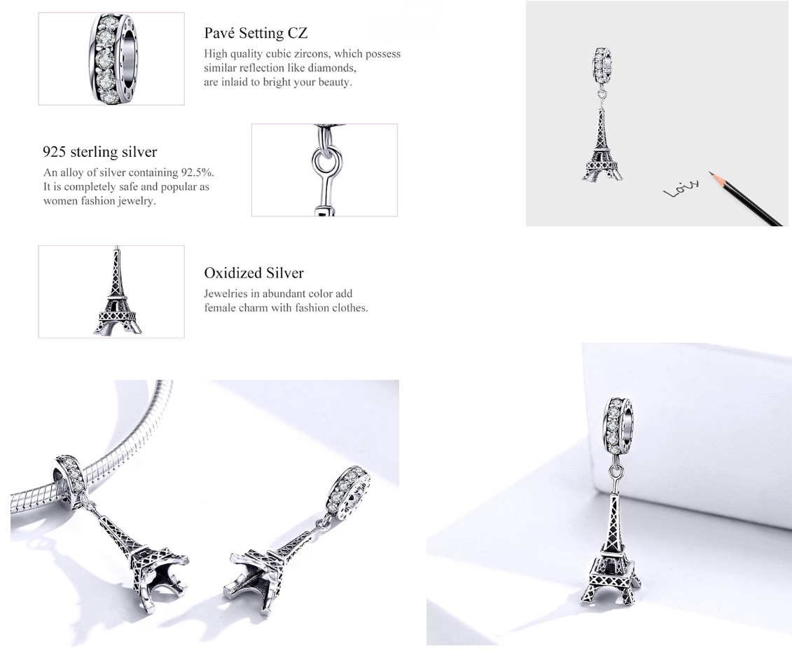 Detailný prívesok Eiffelovej veže sa dokonale hodí k ostatným príveskom z cestovateľskej kolekcie. Svoje spomienky tak môžete mať stále pri sebe. Prívesok je kompatibilný s náramkami Pandora, Biagi, Trollbeads a Chamilia. Tento očarujúci prívesok je ideálnym darčekom pre vašich blízkych. Objednajte si teraz a vytvorte si vlastné nezabudnuteľné chvíle, ktoré si budete pamätať celý život. Buďte originálni, jedineční!