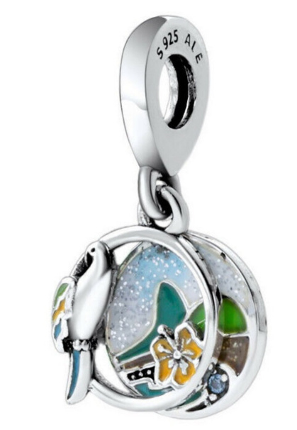 Privolajte si spomienky na Brazíliu s týmto farebným závesným príveskom!Predný disk sa skladá z dvoch prvkov a je na ňom papagáj s jasným perím a žltý smaltovaný kvet ibišteka.Za trblietavou plážovou scénou sú zobrazené modré a zelené emaily a bledomodré kamene.Na zadnej strane prívesku je vyrytý nápis "Love Brazil".