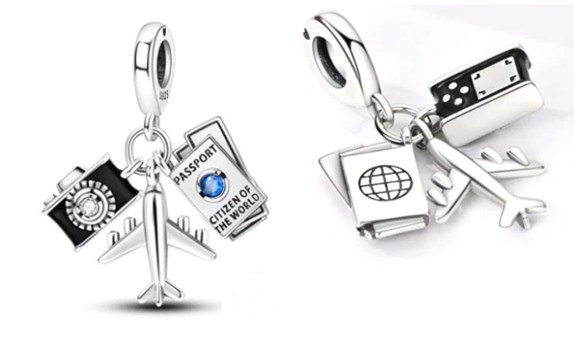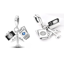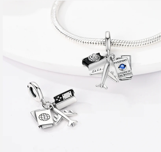 Prívesok s fotoaparátom, lietadlom a pásom s bielymi a modrými trblietavými zirkónmi a hladkým čiernym smaltom. na zadnej strane pasu je vyrytý nápis "pas občana sveta"a malý glóbus . roztomilý doplnok k vašim cestovateľským príbehom .