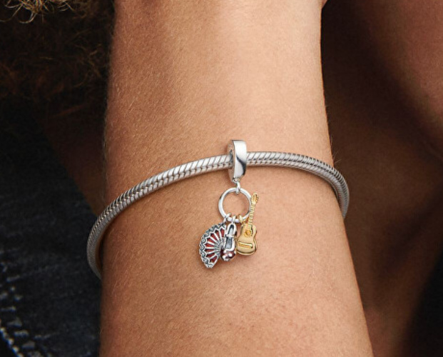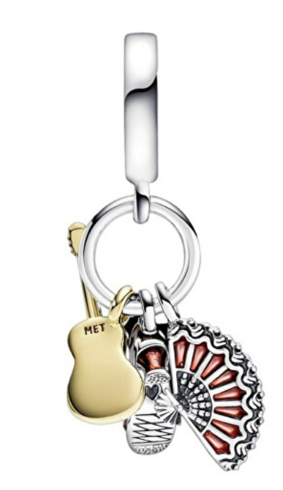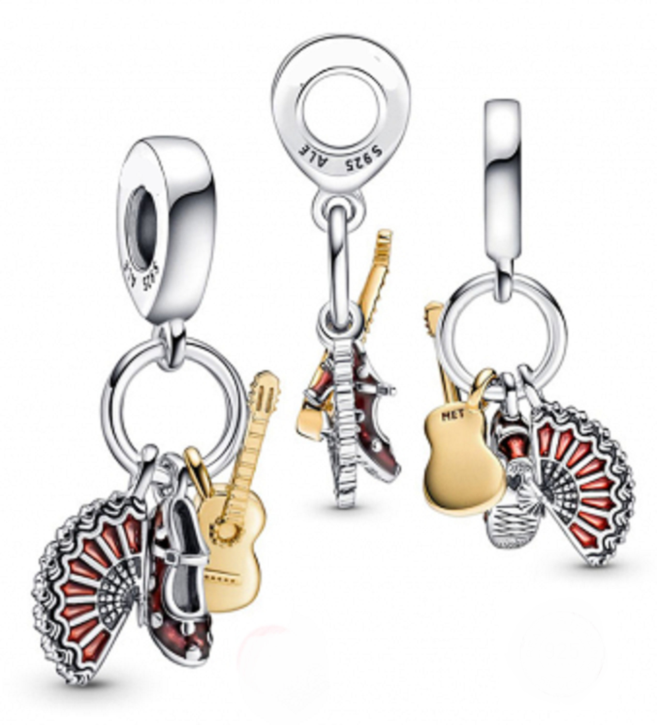 Tancujte s duchom Španielska, ktorý symbolizuje nový prívesok Spanish Flamenco Guitar, Shoe & Fan Dangle Charm! Tento ozdobný prívesok, inšpirovaný slávnym hudobným dedičstvom Španielska, obsahuje tri prvky zavesené na krúžku: krásny čipkovaný vejár zdobený smaltmi plique-à-jour, hrubú flamencovú topánku ručne maľovanú priehľadným červeným smaltom a malú gitaru pozlátenú zlatom.Na zástave je tiež vyrytý nápis "ŠPANIELSKO", čo z nej robí očarujúci suvenír.
