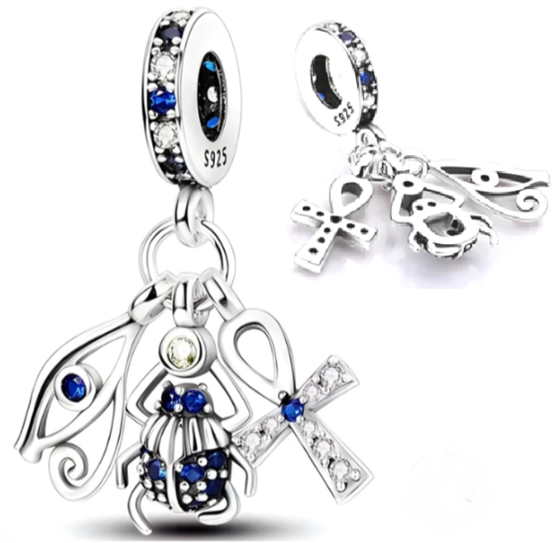 Prívesok so staroegyptskými symbolmi, ktorý sa nosil na ochranu a pre šťastie.navrhnuté s modrými a bielymi zirkónmi.ANKH, známy ako kľúč života, je symbolom večného života.Horovo oko je symbolom zdravia a ochrany a skarabeus symbolizuje vychádzajúce slnko a vzkriesenie.