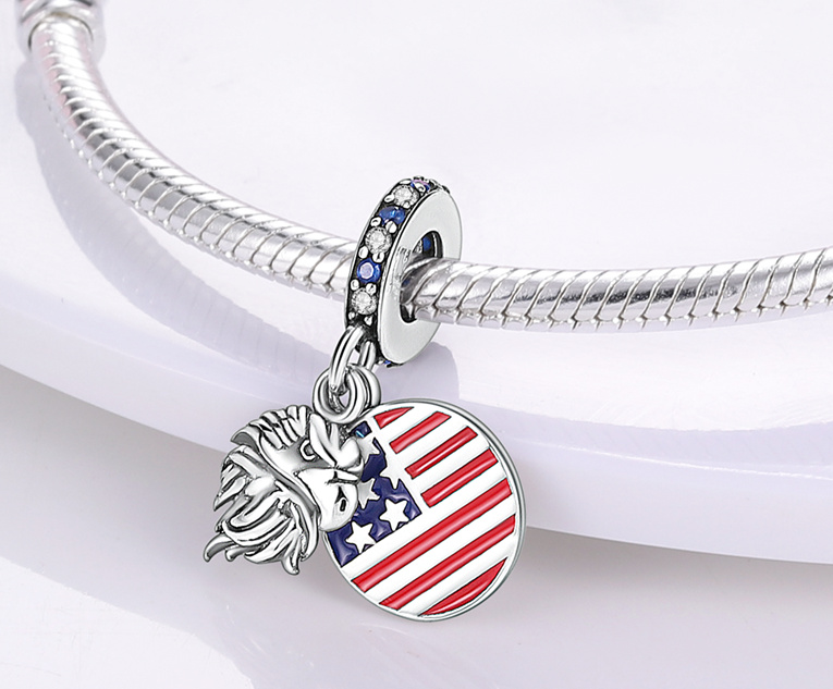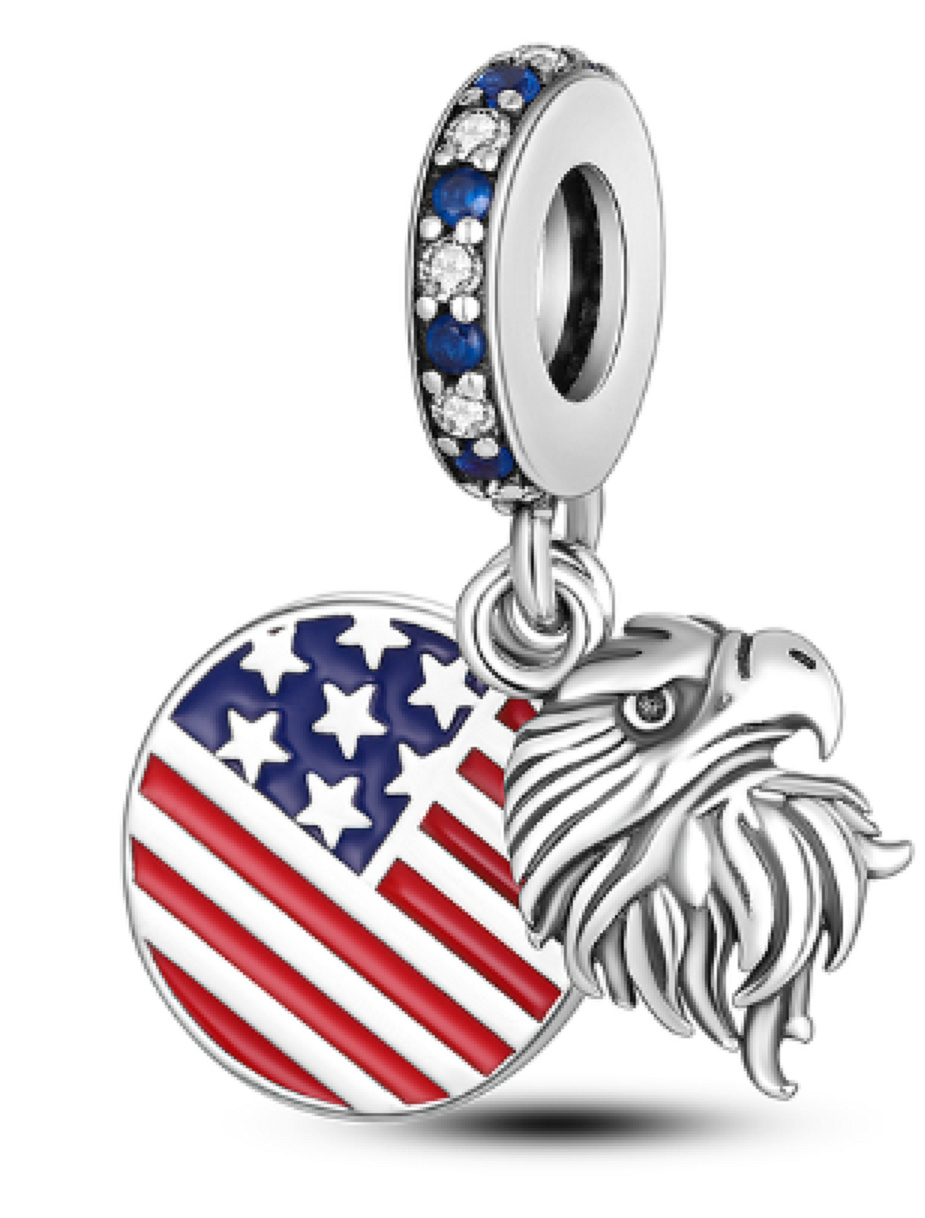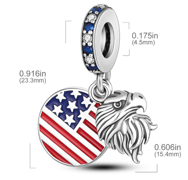 Dvojitý prívesok s americkou vlajkou a hlavou orla navrhnutý s hladkým modrým, bielym a červeným smaltom a modrými a bielymi trblietavými zirkónmi.Boli ste na výlete v USA a chcete si priniesť spomienku na túto úžasnú krajinu? Kúpte si prívesok na náramok v tvare vlajky USA a hlavy orla - ako symbol USA, ktorý vám bude na náramku pripomínať túto krásnu cestu.