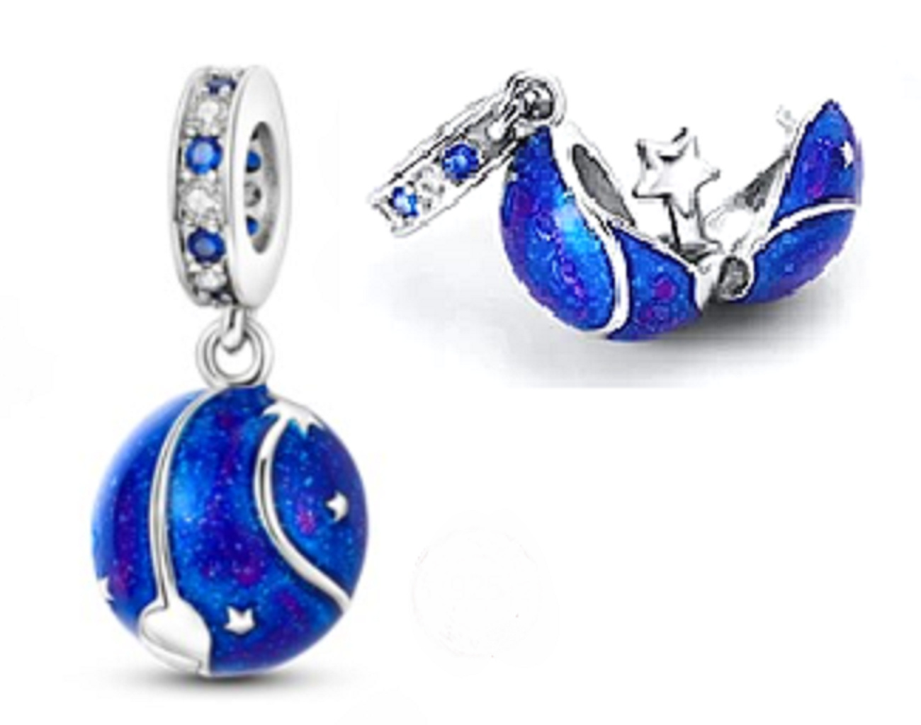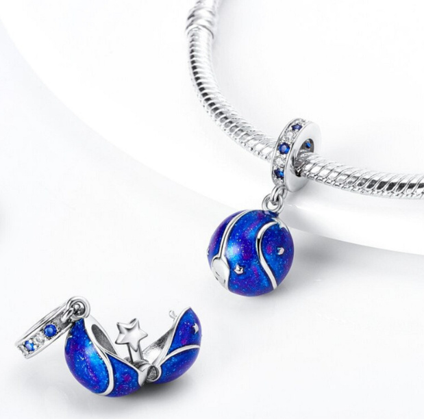 Hviezdy na nočnej oblohe sa jedna po druhej rozsvecujú. Dokážete ich spočítať? Vesmírny prívesok navrhnutý s hladkým modrým smaltom a trblietavými bielymi a modrými zirkónmi. Prívesok sa otvára a odhaľuje roztomilú hviezdičku.