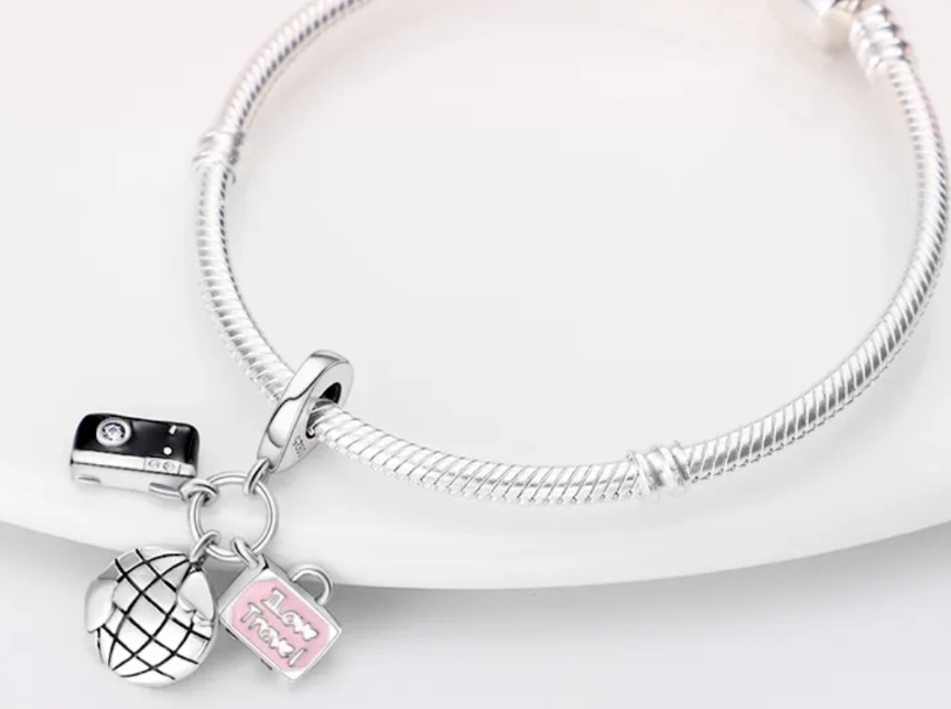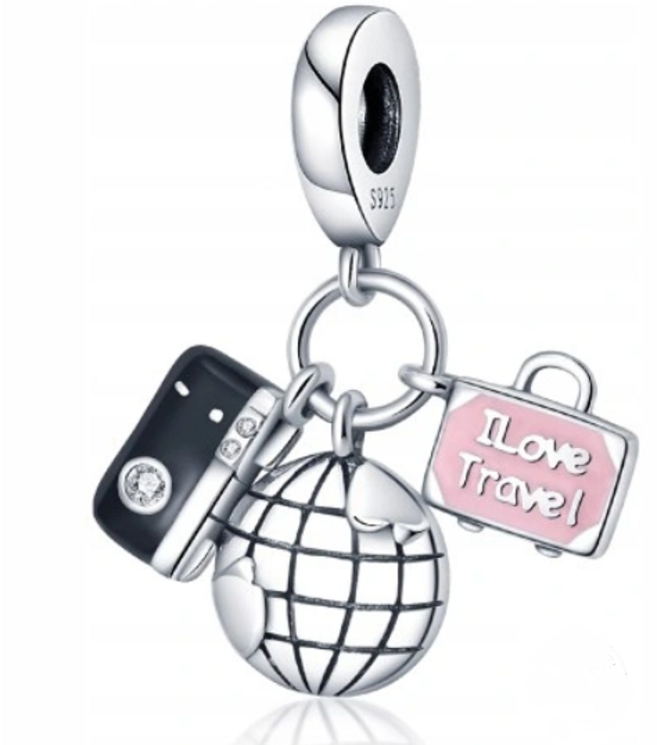 Je čas zbaliť si veci a pridať do svojej zbierky prívesok na fotoaparát, glóbus a kufrík . tri prívesky v jednom - tento šperk je snom každého cestovateľa. Fotoaparát je detailne prepracovaný, na mieste objektívu je trblietavý zirkón, na glóbuse sú poludníky a rovnobežky a ružové puzdro je doplnené názvom "I Love Travel" v ručne nanesenom ružovom smalte. Pridajte tento cestovateľský prívesok do svojej zbierky ako prísľub budúcich dobrodružstiev alebo ho darujte najlepšiemu priateľovi, ktorý rád cestuje.