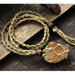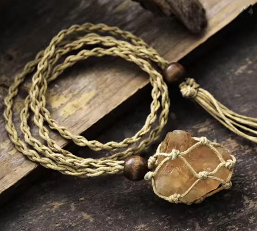 Tento originální náhrdelník z přírodního citrínu zaujme svým zemitým boho stylem a autentickým vzhledem. Surový kámen je zasazen do ručně pletené textilní síťky, která podtrhuje jeho přirozenou krásu a dělá z každého kusu jedinečný šperk. Přírodní šňůrka doplněná dřevěnými korálky a ozdobným zakončením působí harmonicky a přirozeně. Tento náhrdelník není jen doplněk, ale také osobní talisman s hlubokým významem.