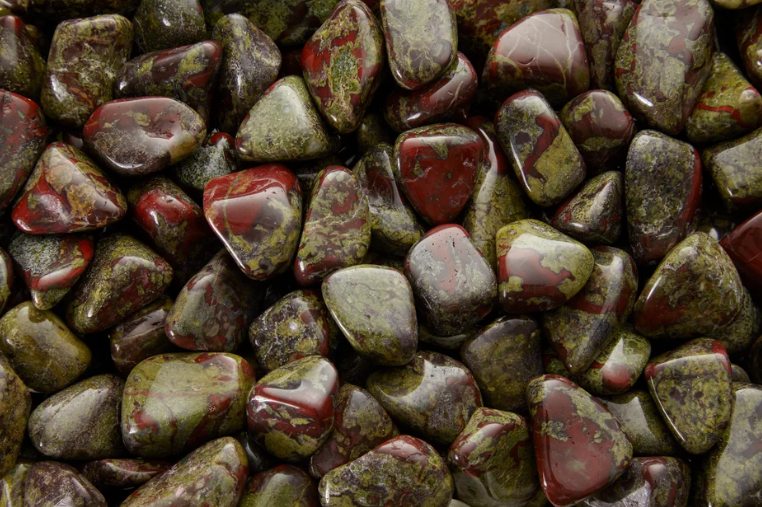 Zelený epidot (alebo kremičitan vápnika, hliníka a Železa), do ktorého prenikajú tenké žilky červeného a červenohnedého Jaspisu (t. j. zmesi chalcedónu, Opálu a hematitového Pigmentu). Ide o epidotový jaspis, veľmi atraktívny kameň z provincie Limpopo v Južnej Afrike.
