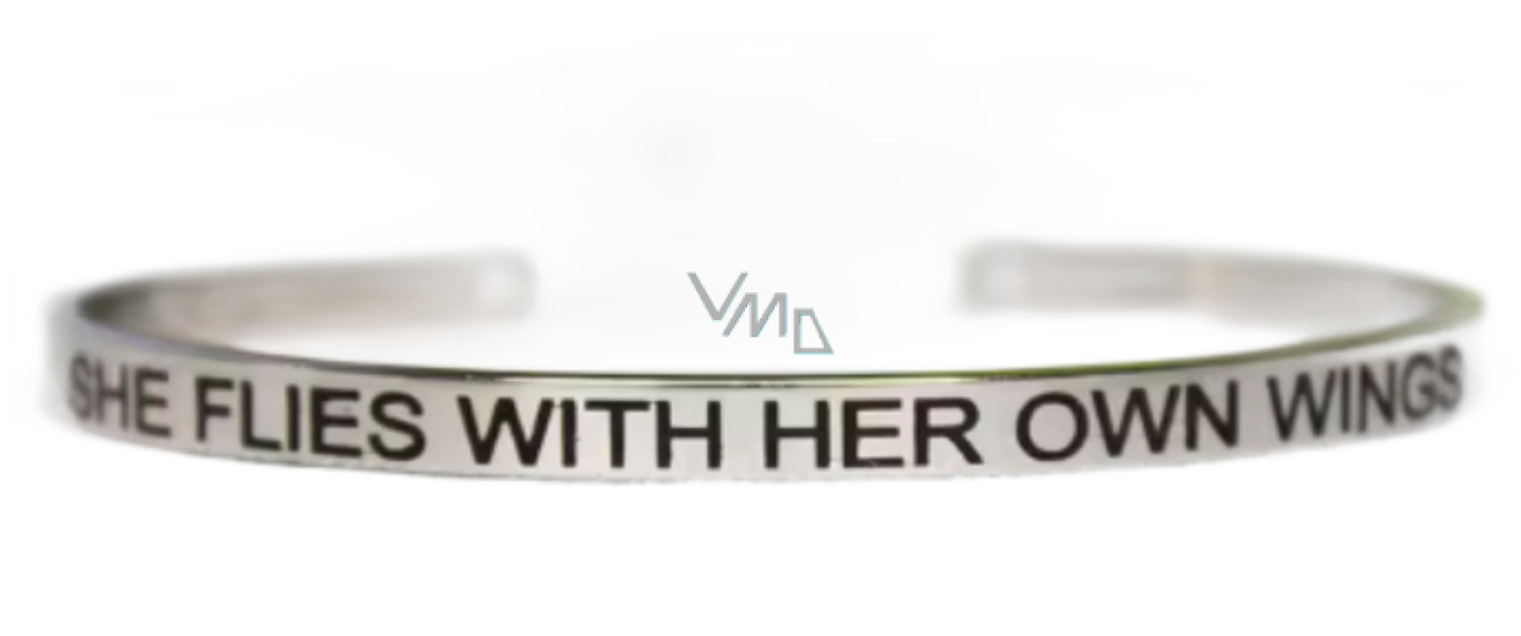 Je dostatočne flexibilný a s jemným stlačením alebo miernym roztiahnutím ho možno nastaviť pre väčšinu veľkostí zápästia. Venujte originálny darček a vyjadrite tak lásku či vďačnosť obdarovanému!- Text: She flies with her own wings - Lieta s vlastnými krídlami