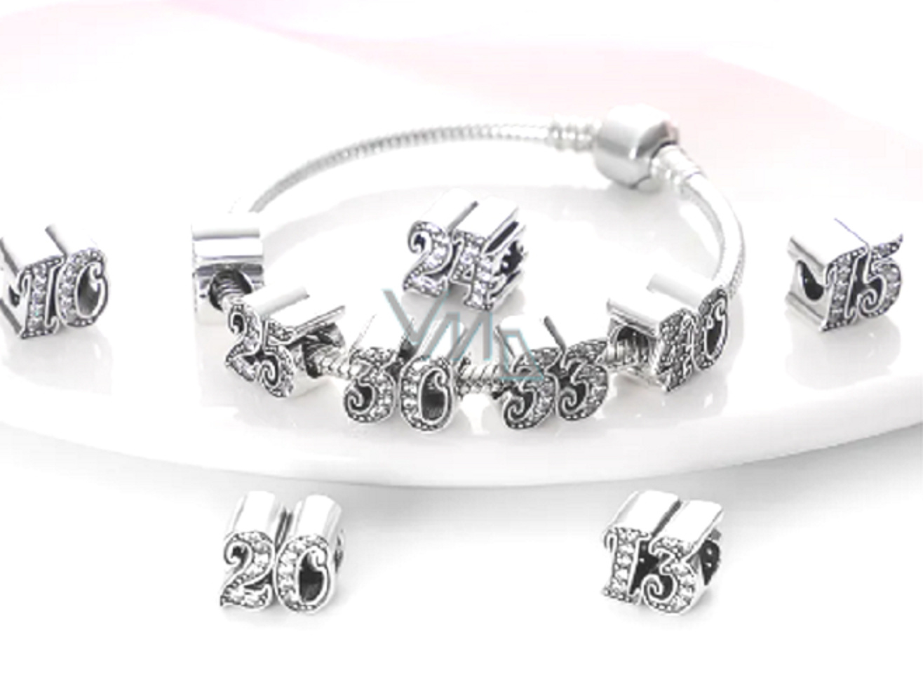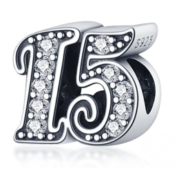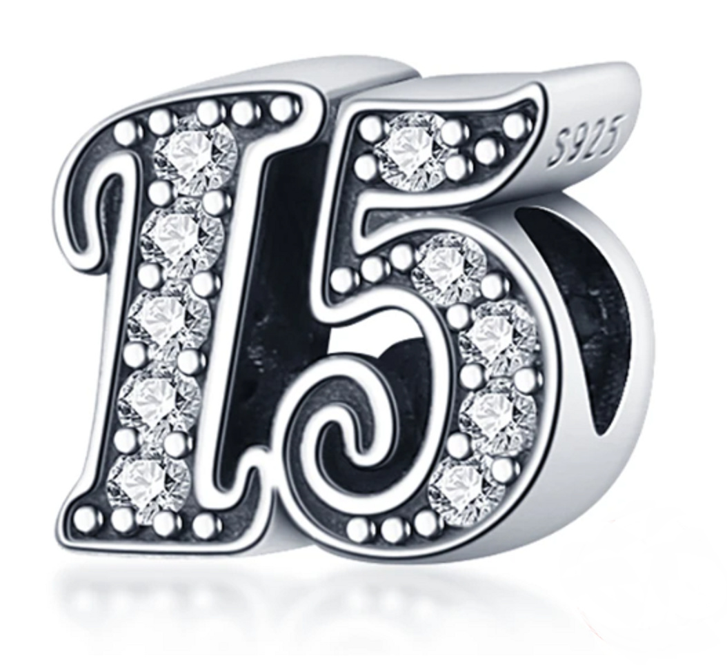Tento strieborný prívesok na náramok vyrobený na oslavu 15. výročie alebo nezbedné 15. narodeniny, je zdobený zirkónmi a korálkovými detailmi.