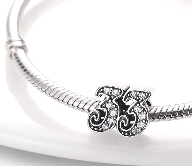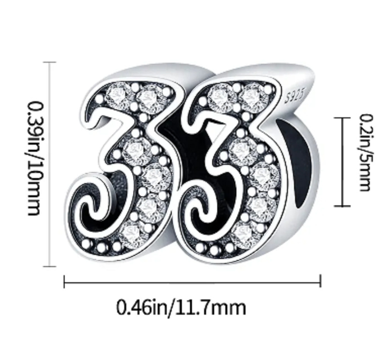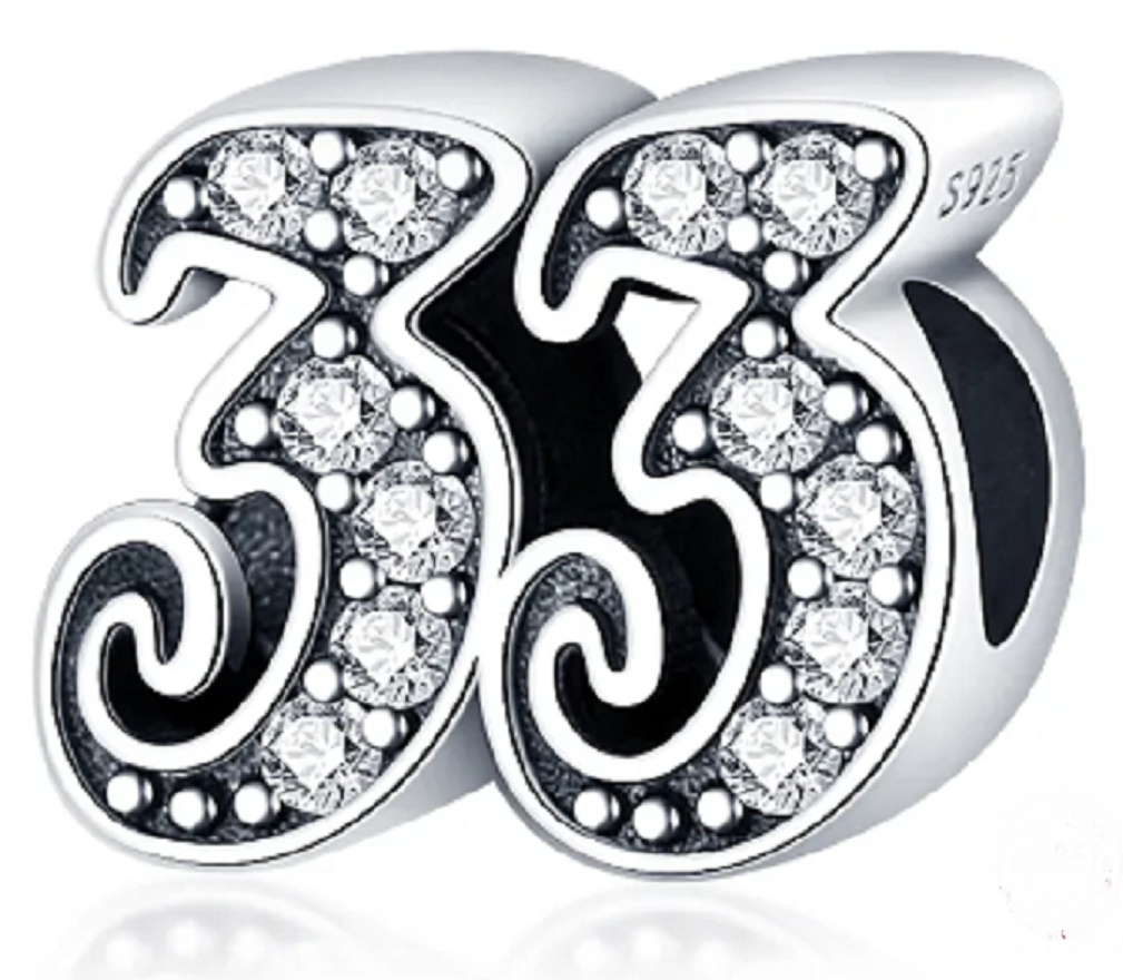 Tento strieborný prívesok na náramok vyrobený na oslavu 33. výročie alebo nezbedné 33. narodeniny, je zvýraznený kubickými zirkónmi a korálkovými detailmi.