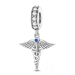 Prívesok s kaducéom, symbolom medicíny, ktorý tvoria dva hady prepletené na tyči s anjelskými krídlami, navrhnutý s modrými a bielymi trblietavými zirkónmi.