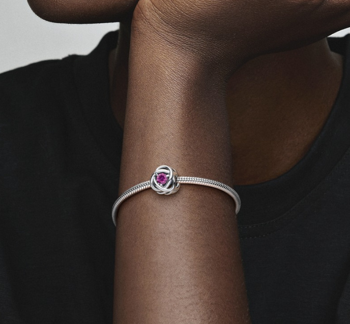 Strieborný korálik s motívom večnosti. Dodajte svojim náramkom a príveskom šmrnc pomocou tohto večného kruhu. Tento špeciálny kúsok je vyrobený v tvare nekonečného vrkoča a vo svojom strede je osadený ružovým kryštálom. Symbolizujúci večnosť, pridajte toto iskrivé kúzlo do svojho štýlu, aby vaše každodenné šperky získali jasnú aktualizáciu.