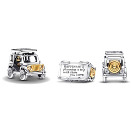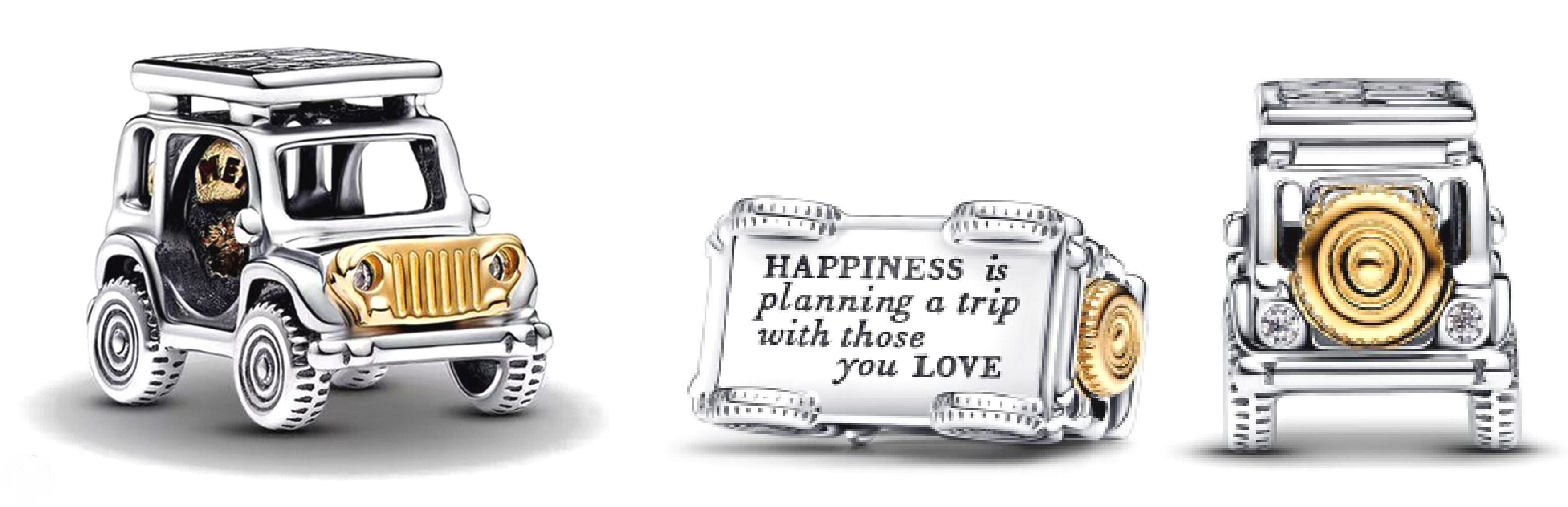 Doplňte svoju túžbu dvojfarebným príveskom dobrodružstva. Tento strieborný prívesok zobrazuje auto so všetkými detailmi, od bočných zrkadiel až po kolesá a realistické šKrabance. Rezervná pneumatika a mriežka chladiča, jemne pokovované 14-karátovým zlatom, dodávajú kontrast, zatiaľ čo trblietavé kamene pôsobia ako predné a zadné svetlá. Vyrezané písmená na vyvýšenej streche auta hlásajú "ADVENTURE" a gravírovanie na spodnej strane auta hlása"HAPPINESS planning a trip with those you LOVE." Znak letného dobrodružstva na cestách.