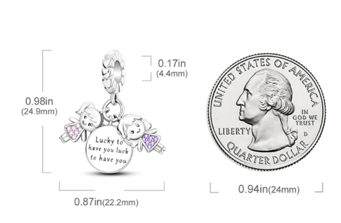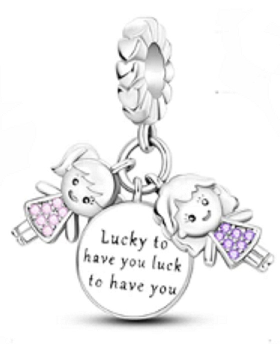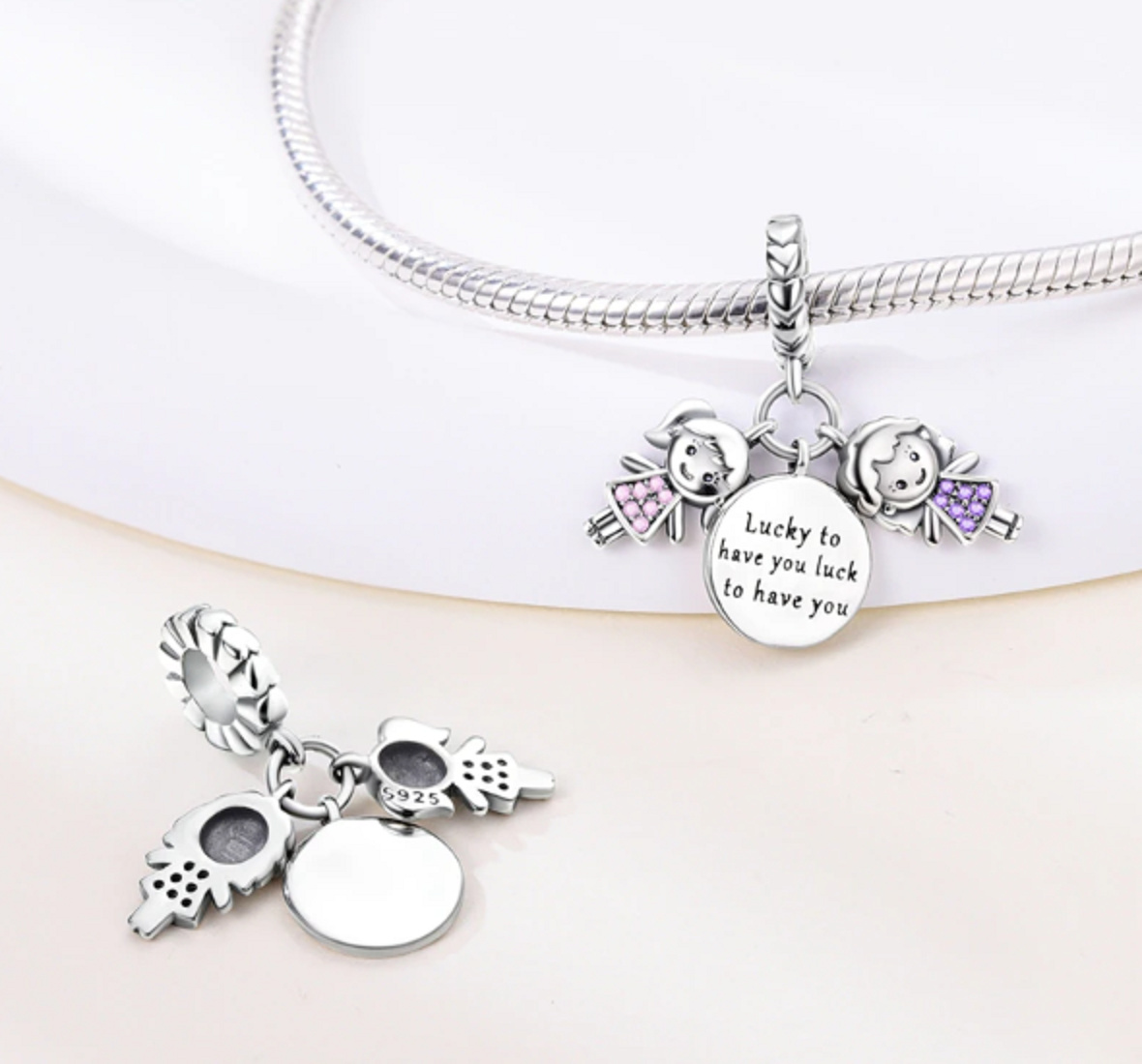 Trojitý prívesok zo striebra 925 s dvoma dievčatkami a príveskom srdca, zdobený žiarivými ružovými a fialovými zirkónmi. Na srdiečku sú vyryté slová "Som šťastný, že ťa mám". Na krúžku prívesku sú malé srdiečka okolo . S každým príveskom vyrozprávajte svoj príbeh a vytvorte náramok, ktorý odráža, kto ste a čo je pre vás dôležité. Váš štýl. Váš náramok. Váš príbeh.