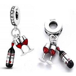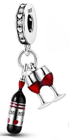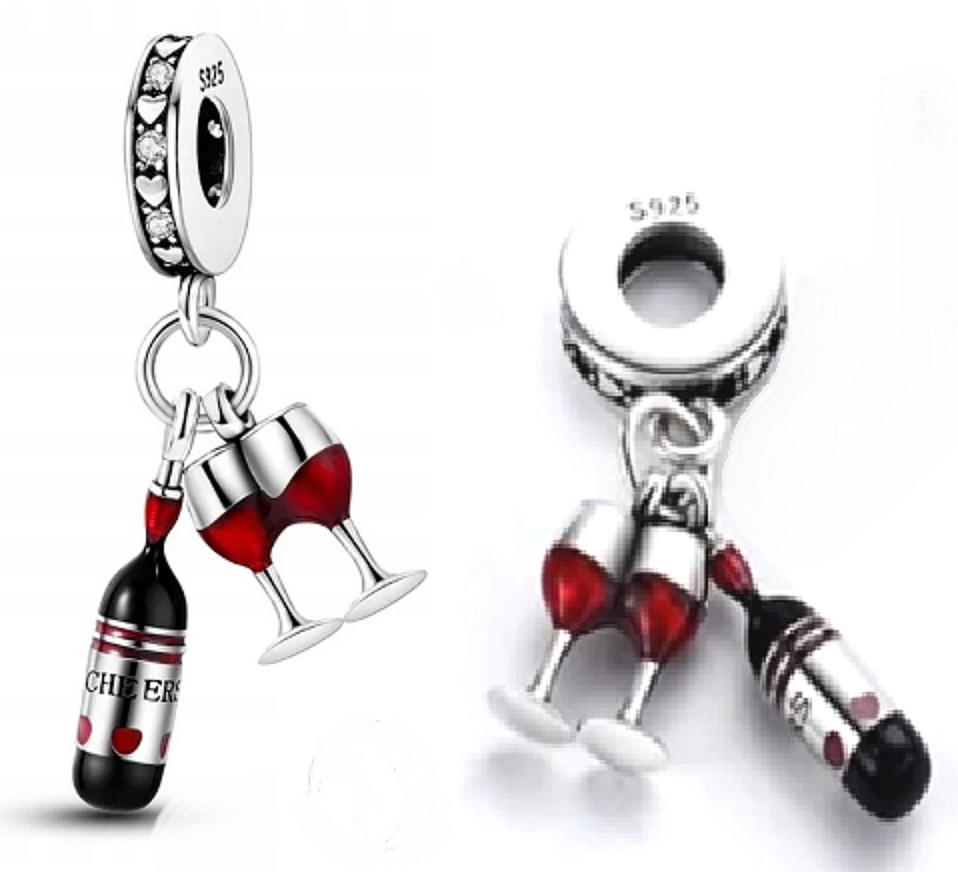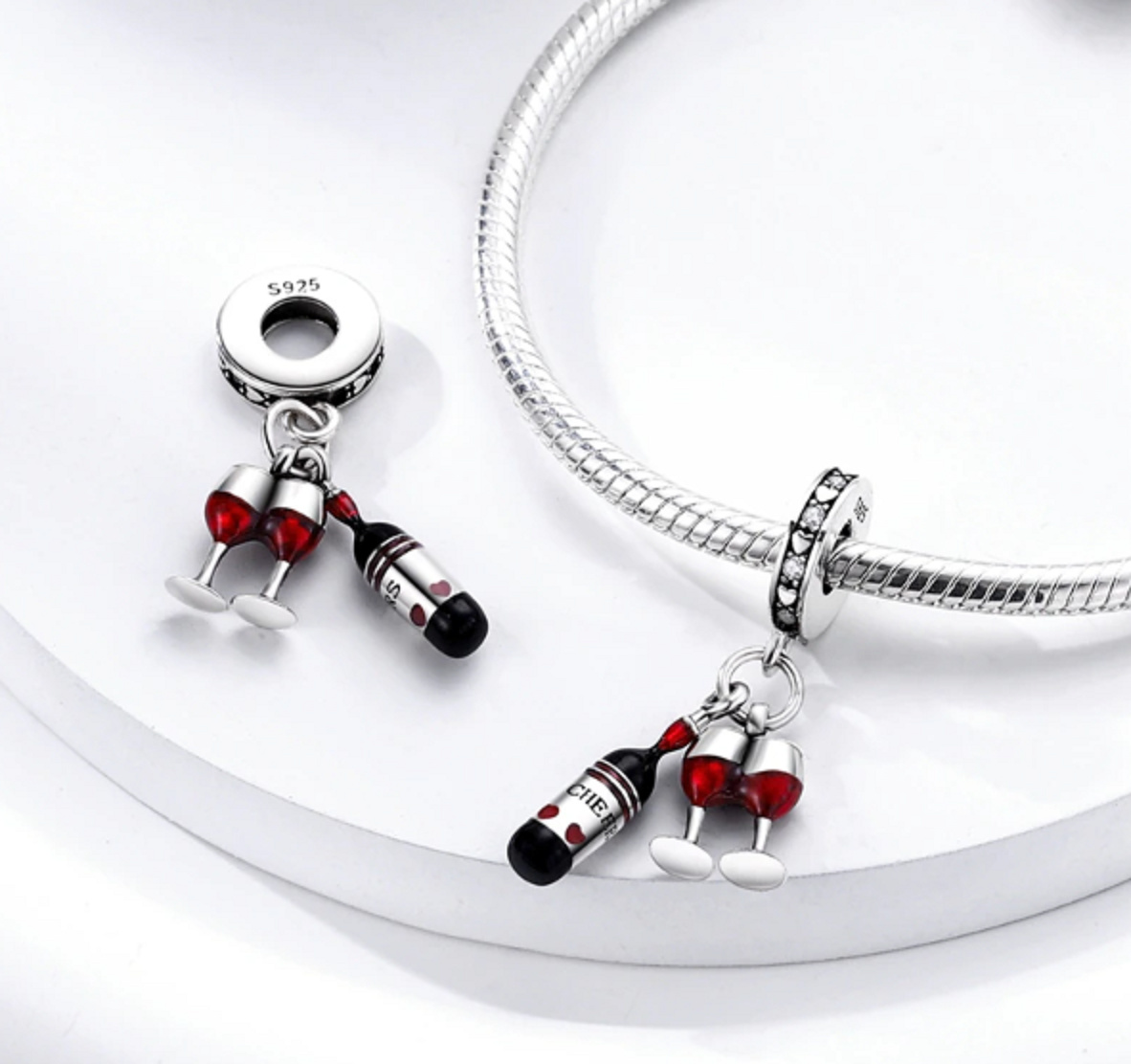 Strieborný prívesok 925 s fľašou červeného vína s nápisom "Na zdravie " na etikete a dvoma pohármi na víno s hladkým čiernym a červeným smaltom. prsteň obsahuje malé srdiečka a biele trblietavé zirkóny po celom obvode. Každým príveskom vyrozprávajte svoj príbeh a vytvorte si náramok, ktorý odráža to, kto ste a čo je pre vás dôležité. Váš štýl. Váš náramok. Váš príbeh.