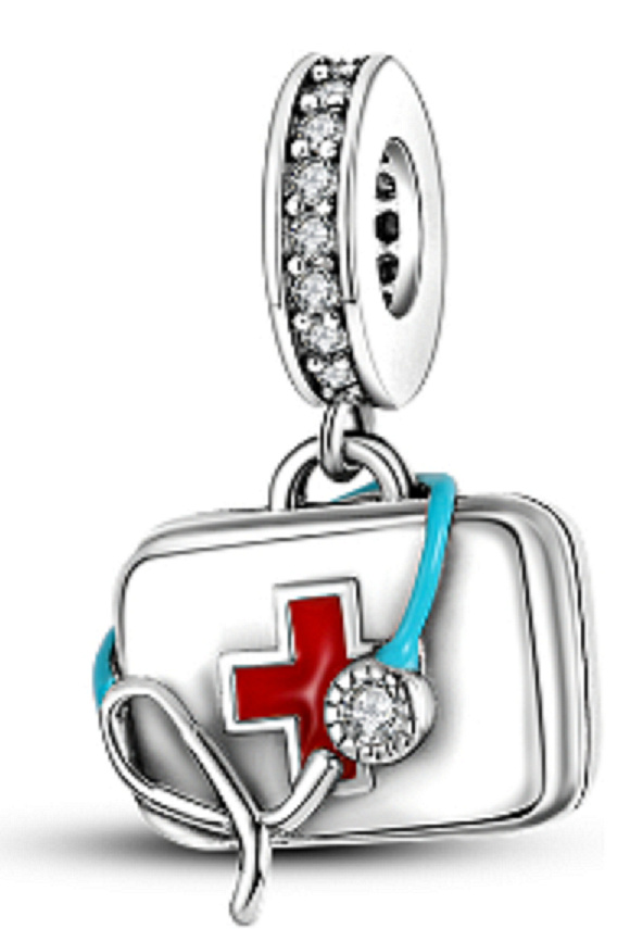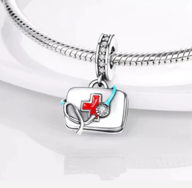 Strieborný prívesok 925 s lekárničkou a stetoskopom, navrhnutý s červeným a modrým smaltom a bielymi trblietavými drahokamami kubickými zirkónmi. krásna pocta lekárskemu svetu.