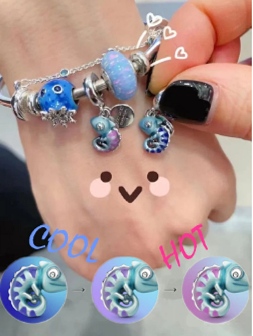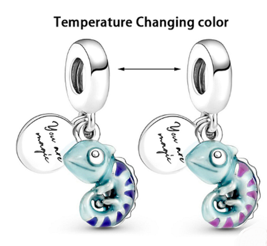 Tento transformujúci sa chameleón je symbolom prispôsobivosti a zmeny a pripomína vám, aby ste žili život v celej jeho pestrosti. Tento prívesok chameleóna vyrobený zo striebra 925 má špeciálny termochromatický smalt, ktorý mení farbu v závislosti od zmeny teploty - od svetlo modrozelenej cez tmavomodrú na tele až po tmavú fialovú a ružovú na pruhoch. Na malom striebornom štítku pripevnenom k očku je napísané "You are magic" (Si čarovná), čo vám pripomína vášho vnútorného chameleóna.