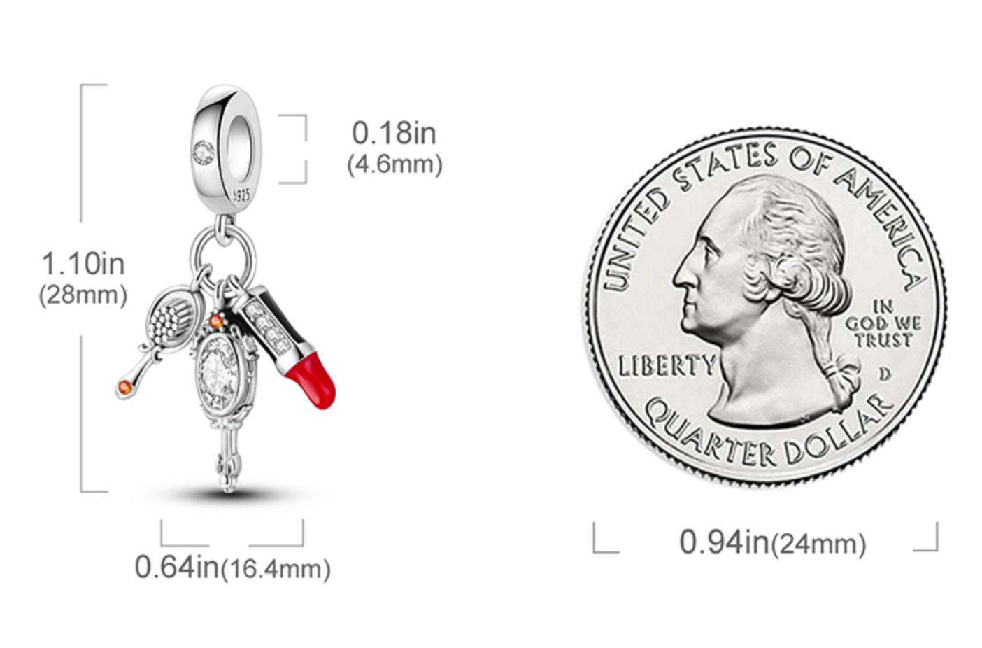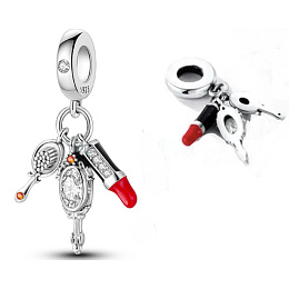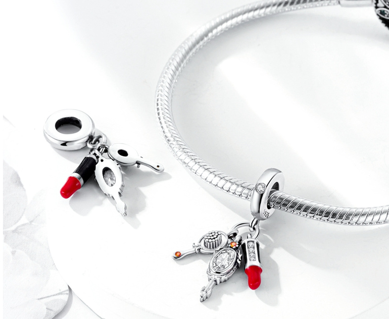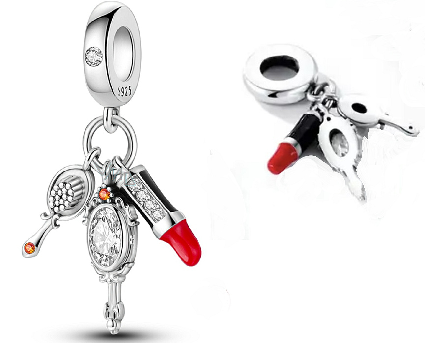 Strieborný prívesok 925 s červeným rúžom, zrkadielkom a štetcom s bielymi a oranžovými trblietavými zirkónmi a hladkým červeným a čiernym smaltom.S každým príveskom vyrozprávajte svoj príbeh a vytvorte náramok, ktorý odráža, kto ste a čo je pre vás dôležité.Váš štýl.Váš náramok.Váš príbeh.