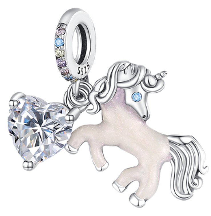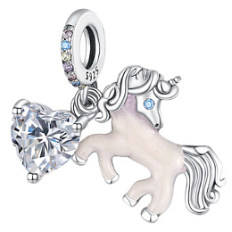 Strieborný prívesok 925 s jednorožcom, navrhnutý s hladkým ružovým smaltom. na krúžku prívesku sú okolo drobné farebné zirkóny. jednorožce symbolizujú slobodu, čistotu a zázraky.
