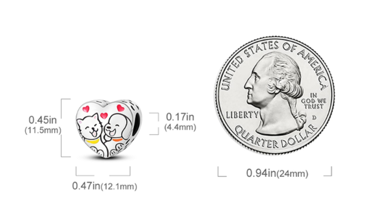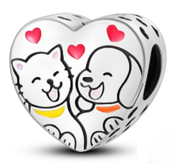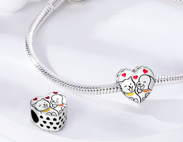 Prívesok v tvare srdca zo striebra 925 s mačkou a psíkom, ktorí sa spolu usmievajú, a malými červenými smaltovanými srdiečkami nad nimi. po stranách prívesku sú malé srdiečka s ažurovým vzorom okolo .S každým príveskom vyrozprávajte svoj príbeh a vytvorte náramok, ktorý odráža, kto ste a čo je pre vás dôležité.Váš štýl.Váš náramok.Váš príbeh.