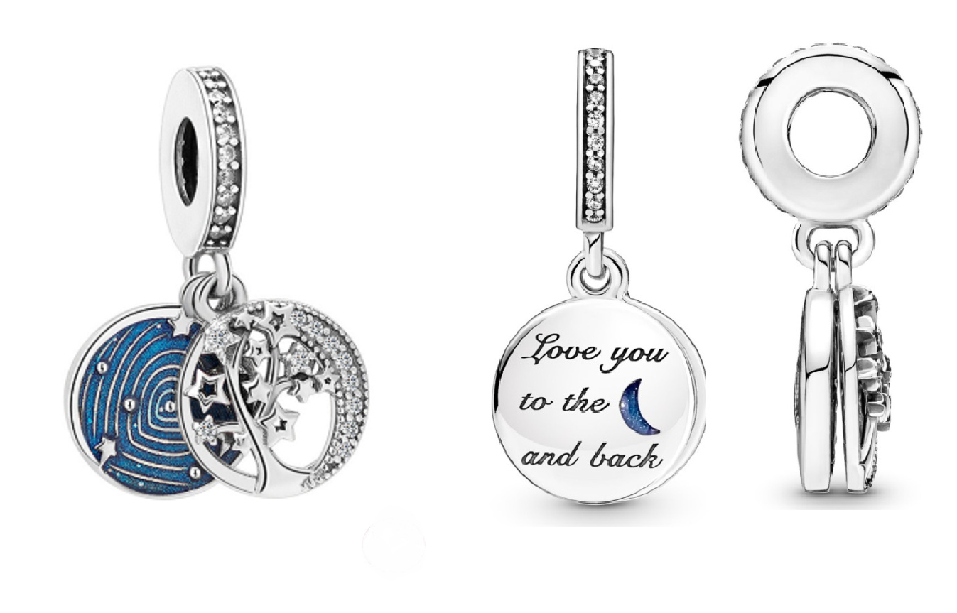 Trblietavý polmesiac orámovaný strieborným okrajom svieti vedľa pekného stromu s listami v tvare hviezdičiek. druhý disk zavesený vzadu zobrazuje galaxiu lásky s trblietavým tmavomodrým smaltom prekrývajúcim línie v tvare srdca a vystupujúce strieborné hviezdy a planéty. Číre zirkónové kamene sú vsadené do tenkého strmeňa pre väčší lesk.