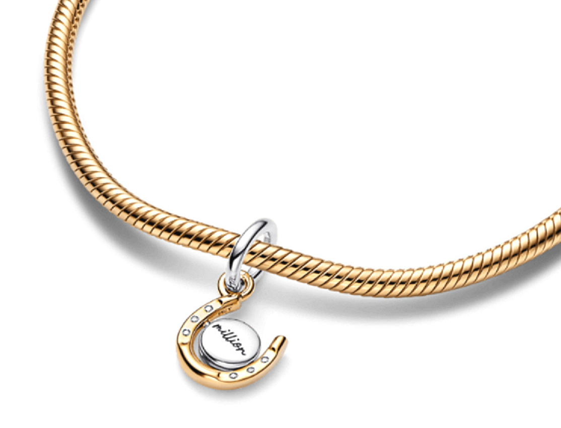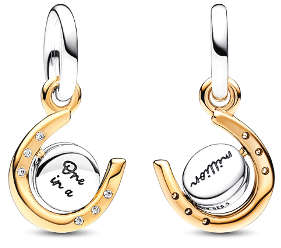Každý potrebuje v živote trochu šťastia a naše dvojfarebné kúzlo podkova s rotujúcim diskom vám ho prinesie.tento prívesok podkovy visí pod uhlom a symbolizuje šťastie pre tých, ktorých máme najradšej.podkova je vyrobená z jedinečnej kovovej zliatiny a jemne pozlátená 14-karátovým zlatom druhej triedy.v strede prívesku je otočný disk s vygravírovaným nápisom "One for" a "One Million".skvelých priateľov je jeden z milióna, preto darujte tento symbolický prívesok niekomu, koho máte radi, alebo ho noste ako symbol šťastia a ochrany.