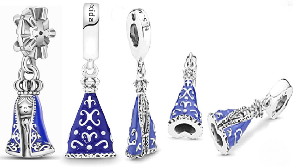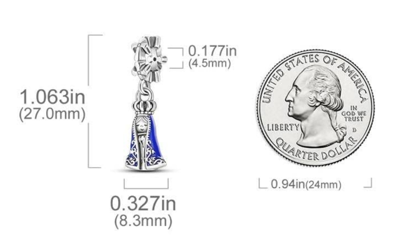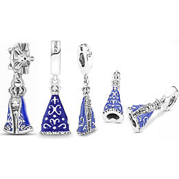 Prívesok Panny Márie Nossa Senhora Aparecida z čistého striebra 925, ktorý sa nosí na duchovné vedenie a ochranu.Navrhnutý s bielymi trblietavými zirkónmi a hladkým modrým smaltovaným rúchom a korunkou z korálok .