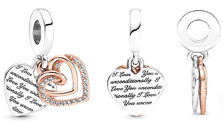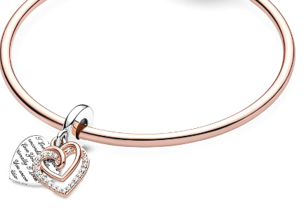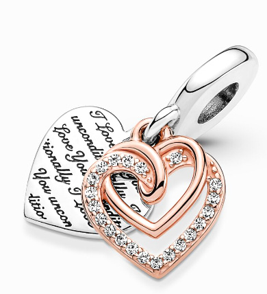 Je ručne spracovaný zo striebra 925 a jemného 14-karátového ružového zlata a zdobený čírymi zirkónmi s dvoma spojenými srdiečkami, ktoré predstavujú večnú lásku.