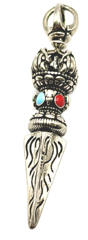 Tento jedinečný tibetský přívěsek Phurba (Kilaya) není jen šperk – je to silný ochranný amulet s hlubokým duchovním významem. Tradiční rituální dýka Phurba pochází z tibetského buddhismu a po staletí se používá k odstraňování negativní energie, bloků a zlých vlivů. Detailně propracovaný design symbolizuje transformaci, ochranu a duchovní sílu. Kombinace kovového těla s barevnými kameny (Tyrkysová a červená) podporuje rovnováhu energie, vitalitu a ochranu před negativitou.